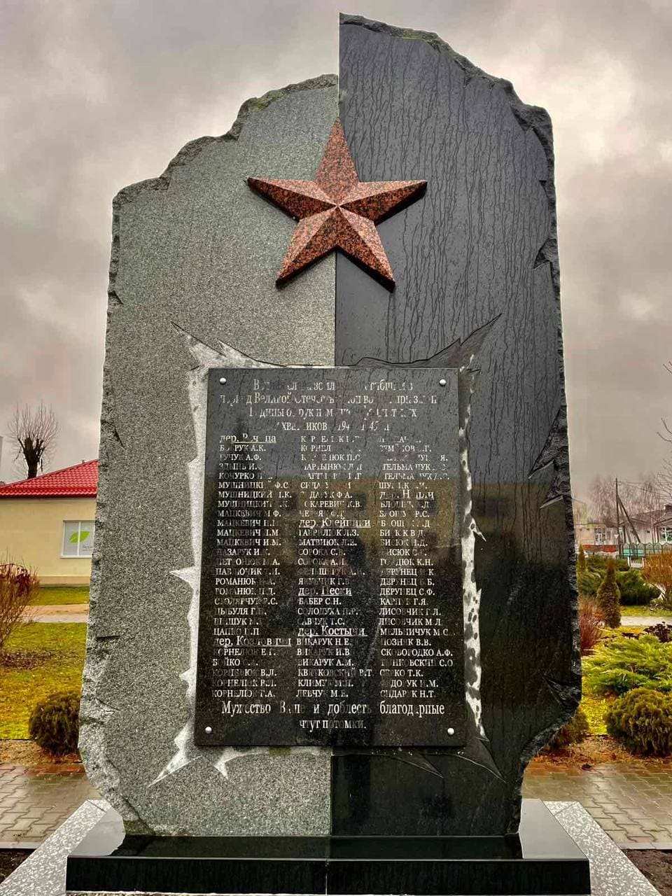 Памятник представляет собой стелу, состоящую из двух гранитных плит серого и чёрного цвета, которые соединены между собой каменной плитой и красной пятиконечной звездой.