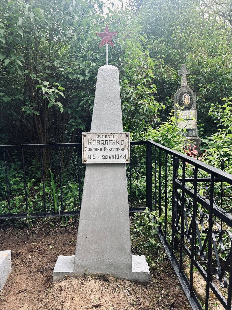 Захоронен Коваленко Гавриил Николаевич, 1915 г.р., рядовой, автоматчик 67-го стрелкового полка 20-й стрелковой дивизии 20-го стрелкового корпуса 28-ой армии, был ранен в ходе Люблинско-Брестской наступательной операции, умер в госпитале 30.07.1944 года. Из историко-документальной хроники Брестского района «Память» «…28 июля 1944 года в ходе Люблинско-Брестской наступательной операции — одной из составных частей Белорусской наступательно операции («Багратион») — 70-я армия форсировала Западный Буг, обошла Брест с юго-запада, а 28-я армия вышла к Западному Бугу северо-западнее Бреста. Пути отхода брестской группировки противника на запад были отрезаны. Войска 61-й армии при содействии части сил 70-й и 28-й армии...»