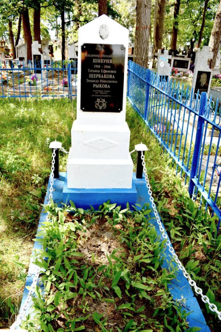 Захоронены: Шибуня Владимир Михайлович, родился в д. Пугачево Брестского р-на Брестской области, Щербакова Татьяна Ефимовна, родом из Костюковичского р-на Могилевской области. Шибуня Владимир Михайлович, Щербакова Татьяна Ефимовна и Рыкова Зинаида Николаевна в 1943 году вступили в ряды партизан. Погибли в 1944 г. Перезахоронены в д. Каменица- Жировецкая в 1965 году Из историко-документальной хроники Брестского района «Память»: «Атрад імя М.М.Чарнака (да червеня 1943 г. – Старасельскі атрад) Створаны ў чэрвені 1941 г. у Старасельскім лесе Жабінкоўскага раёна з ваеннаслужачых 84-га і 125-га стралковых палкоў, пагранічнікаў і жыхароў Старасельскага сельсавета. Да ліпеня 1943 г. дзейнічаў самастойна. У маі 1943 г. прысвоена імя намесніка камандзіра атрада па разведцы М.М.Чарнака, які загінуў у баі 2 мая 1943 г. 22 сакавіка 1944 г. атрад злучыўся з часцямі Чырвонай Арміі, быў рэарганізаваны і 15 мая зноў накіраваны ў тыл ворага, у Жабінкоўскі раён. У другі раз злучыўся з савецкімі войскамі 21 ліпеня 1944 г. у складзе 607 партызан…»