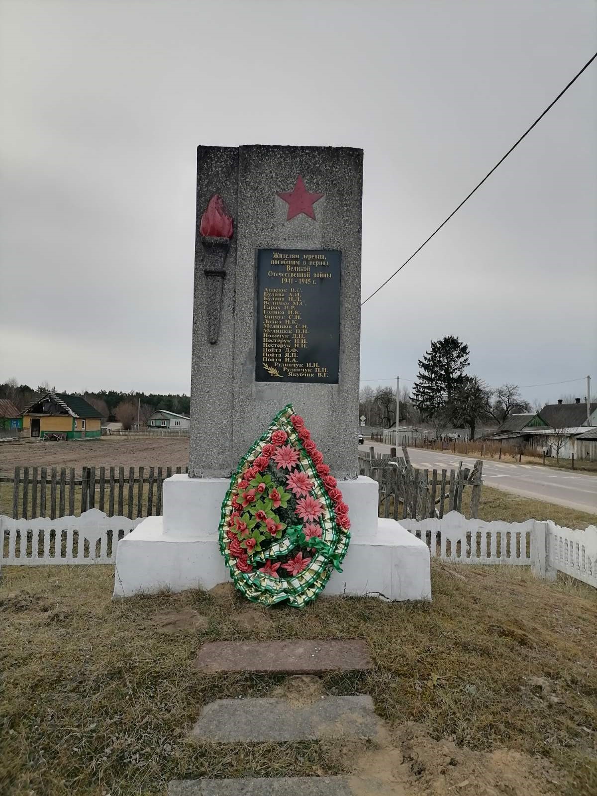 Памятник из гранитной крошки. На памятнике изображение пятиконечной звезды красного цвета, факел и плита из природного обработанного материала с надписью «Жителям деревни, погибшим в период Великой Отечественной войны (1941-1945 г.)» и фамилиями 19 погибших земляков. Территория ограждена бетонным забором. Постамент находится на небольшом возвышении, к которому ведёт дорожка из бетонных плиток.