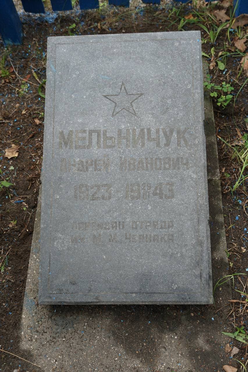 На захоронении мраморная плита 60х90 см с фамилией погибшего. Надпись на памятнике «Мельничук Андрей Иванович, 1923-1943, партизан отряда имени М.Чернака».
