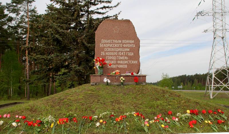 Согласно директиве И. В. Сталина от 28 сентября 1943 года Центральный фронт был переориентирован с Киевского на Гомельское направление. 48-я, 65-я и 61-я армии в начале октября, занял Новобелицкий район города, но с ходу форсировать в этом месте Сож им не удалось. Войска фронта начали прощупывать оборону гитлеровцев на всем протяжении Сожа и Днепра, где обнаружились сильные укрепления. 10 ноября 1943 года, началась одна из первых крупнейших операций по освобождению Белоруссии. С советской стороны в ней участвовало 719 тыс. человек, 7560 орудий и минометов, 247 танков и самоходных артиллерийских установок, 526 самолетов. Утром 26 ноября 1943 года в город с юго-восточного направления, форсировав Сож, вступили части 4-й стрелковой дивизии полковника Д.Д. Воробьёва и рано утром стрелок 1-й роты 39-го стрелкового полка этой дивизии ефрейтор М. Васильев установил красный флаг на здании городской электростанции (ул. Фрунзе). Приказом Верховного Главнокомандующего от 26 ноября 1943 года за № 46 за отличие в боях при освобождении Гомеля и Речицы 23 воинских соединения и части получили почетное наименование «Гомельские». К 25-й годовщине освобождения города Гомеля от немецко-фашистских захватчиков в честь воинов-освободителей Белорусского фронта под командованием К. К. Рокоссовского на 9-м км Черниговского шоссе установлен обелиск из гранита высотой 2 м на постаменте 30 см высотой.