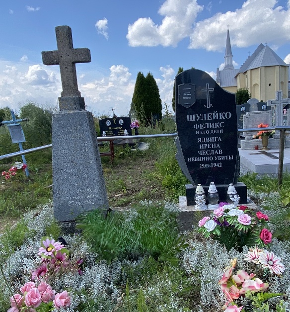 Установлено два памятника: слева – каменный с католическим крестом и надписями на польском языке о захороненных убитых немецко-фашистскими захватчиками членах семьи Шулейко, справа – гранитный памятник с аналогичными надписями на русском языке. Захоронение огорожено забором из металлических нержавеющих труб.
