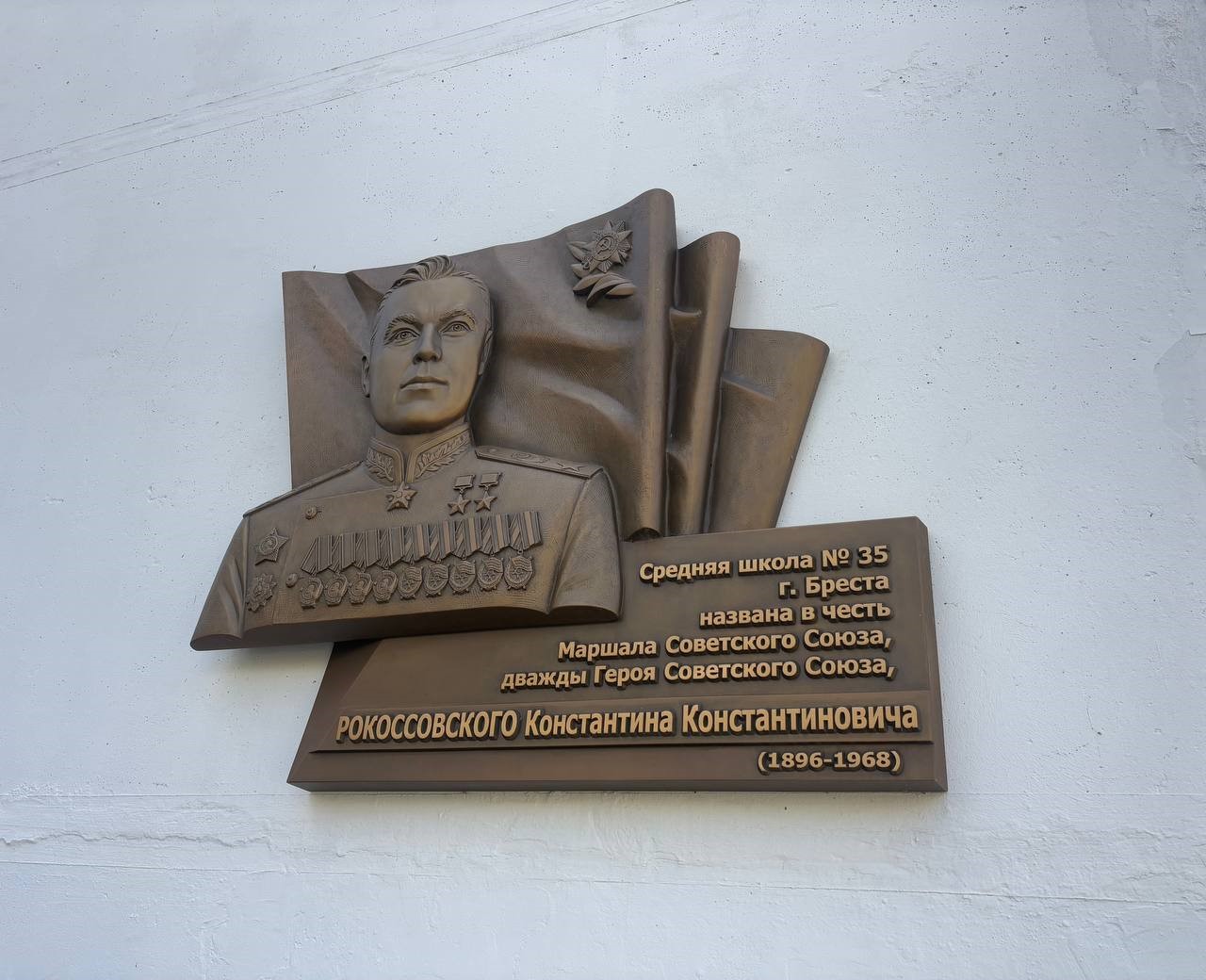 Мемориальная доска с надписью: «Средняя школа №35 г. Бреста названа в честь Маршала Советского Союза дважды Героя Советского Союза Рокоссовского Константина Константиновича (1896-1968)».