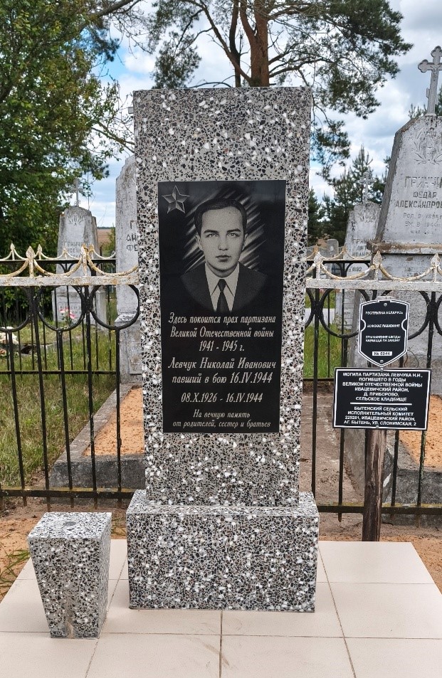 Николай Иванович Левчук – боец-подрывник партизанского отряда «Советская Белоруссия» (командир отряда – Власов В.А.), партизанской бригады им. П.К. Пономаренко Брестской области (командир бригады – Сенькин Н.В.) с сентября 1943 г. – 16 апреля 1944. Принимал участие в налетах на немецкие гарнизоны и их разгроме: в д. Белавичи Коссовского района (ноябрь 1943 г.) в д. Боровики Слонимского района (февраль 1944 г.) Взорвал машинное отделение на лесопильном заводе, расположенном в районе блока железнодорожной станции «Бытень». Совершал диверсии на объектах жизнеобеспечения вражеских войск, на железных и шоссейных дорогах Барановичи – Брест, Барановичи – Лунинец, принимал участие в засадах, в ходе которых: сожжено 2 (две) вражеские автомашины; пущено под откос 4 (четыре) вражеских эшелона с живой силой, техникой и боеприпасами. Погиб 16 апреля 1944 г. в бою с карателями в районе д. Колбовичи Барановичкого района, первоначально был захоронен выжившими боевыми товарищами в лесном массиве возле д. Погорье Бытенского района. После освобождения Бытенского района в июле 1944 г. Левчук Н.И. был торжественно перезахоронен на кладбище д. Приборово Бытенского района.